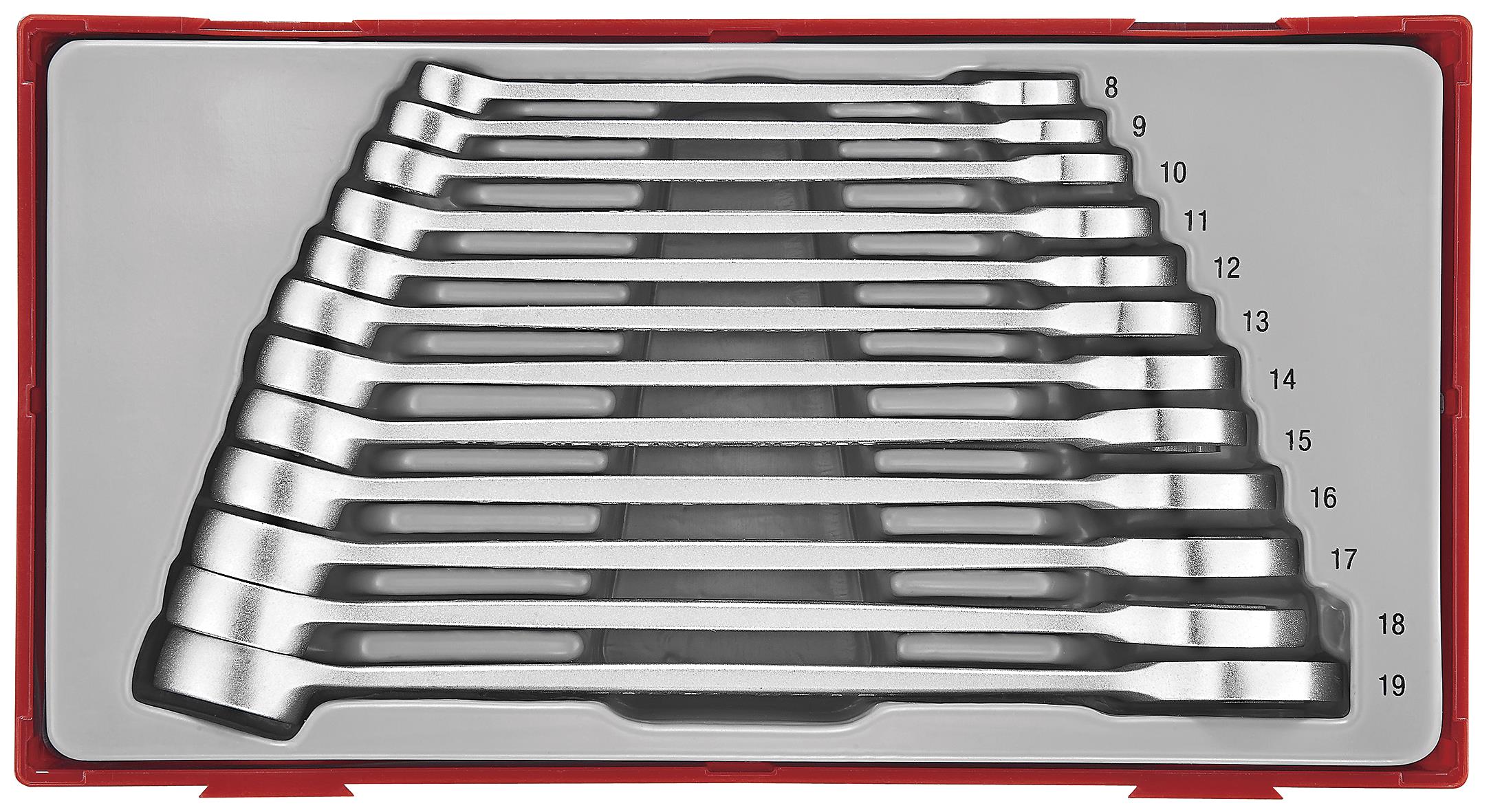 Zestaw 12 kluczy płasko-oczkowych ze stali chromowo-wanadowej, ten sam rozmiar na obu końcach. Główka pierścieniowa dwunastokątna pogłębiona, odgięta pod kątem 15°. Koniec otwarty wykonany w systemie hip-grip, z rowkami przeciwpoślizgowymi. Część chwytowa zwężana w kierunku końców dla polepszenia wygody trzymania. Otwór w części chwytowej do zabezpieczenia narzędzia. Dostarczany w pojemniku z tworzywa sztucznego z odłączaną pokrywą. Pasuje do skrzynek i wózków narzędziowych Teng Tools.