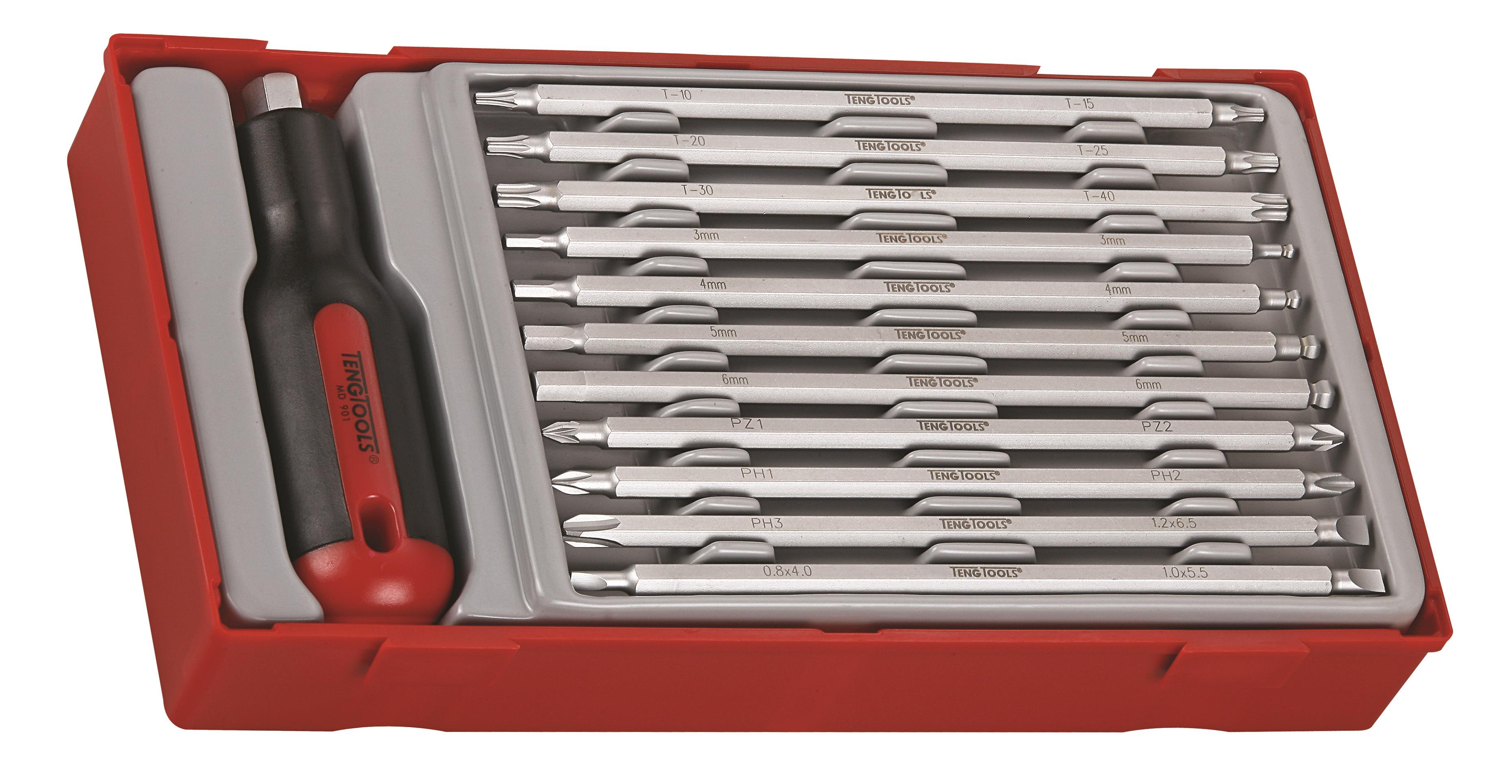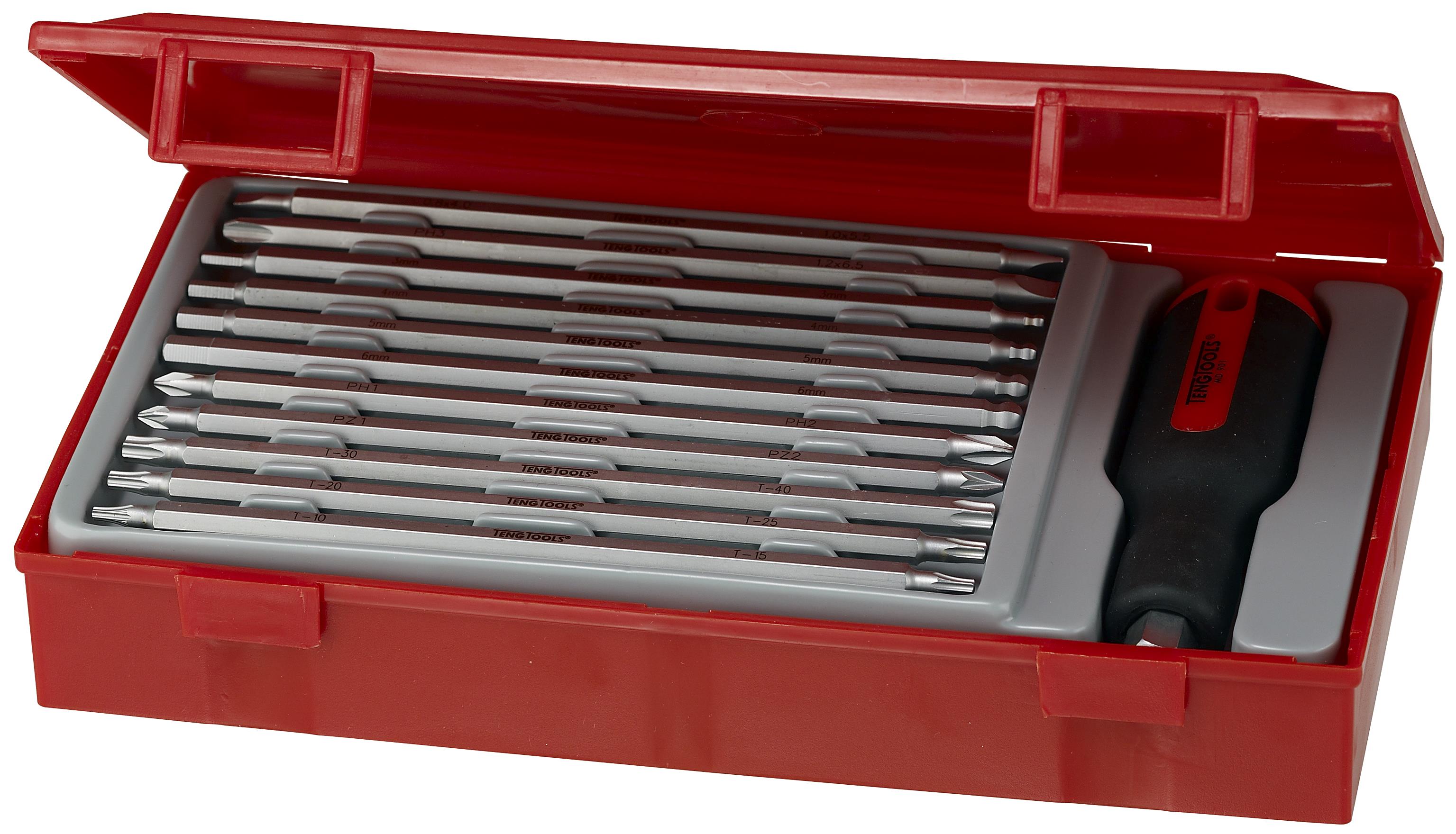 Zestaw z 12 części. Zawiera rękojeść wkrętaka oraz 11 dwustronnych trzonów wymiennych z grotem na każdym końcu. Dostarczany w pojemniku plastikowym z odłączaną pokrywą. Pasuje do skrzynek i wózków narzędziowych Teng Tools.