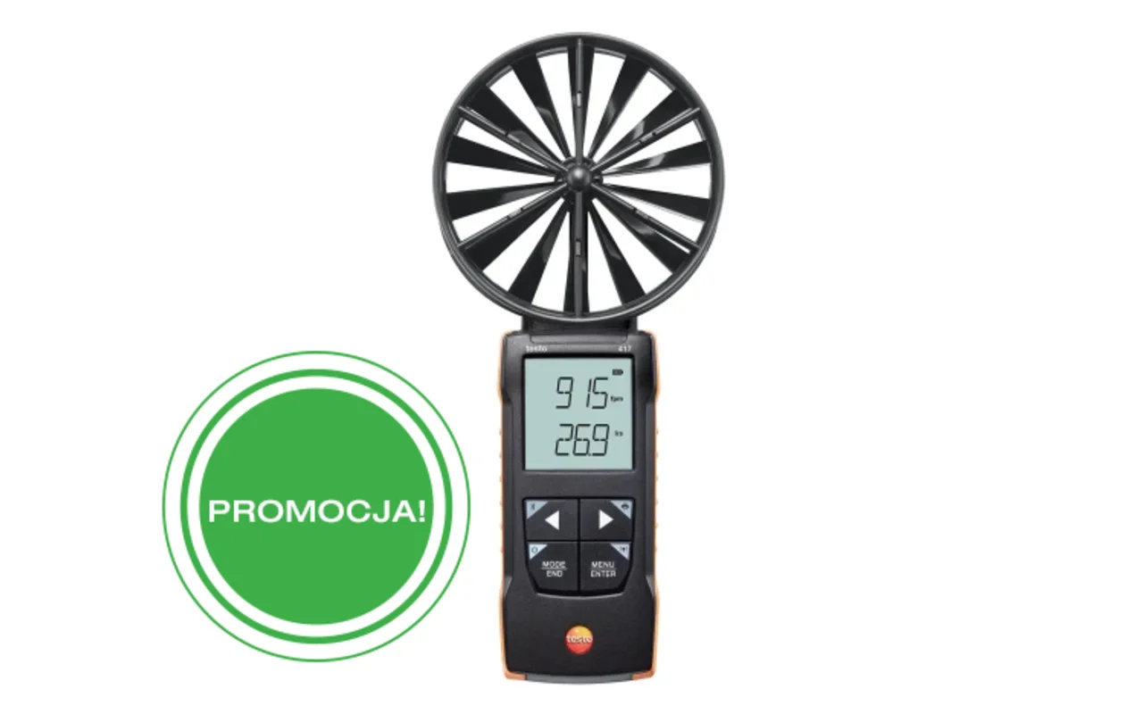 Anemometr wiatraczkowy Testo 417 to niezawodne narzędzie do pomiarów na wlotach i wylotach powietrza w systemach klimatyzacji i wentylacji. Zintegrowana sonda o średnicy 100 mm gwarantuje dokładne wyniki, a urządzenie automatycznie oblicza wartości średnie (czasowe i punktowe) oraz przepływ objętościowy, wyświetlając je bezpośrednio na ekranie.