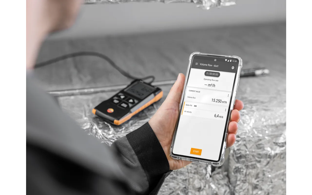 Dzięki integracji z aplikacją Testo Smart App obsługa urządzenia staje się wyjątkowo wygodna – aplikacja umożliwia konfigurację przyrządu, wyświetlanie wyników (także na drugim ekranie), ich zapis oraz pełną dokumentację bezpośrednio na smartfonie.