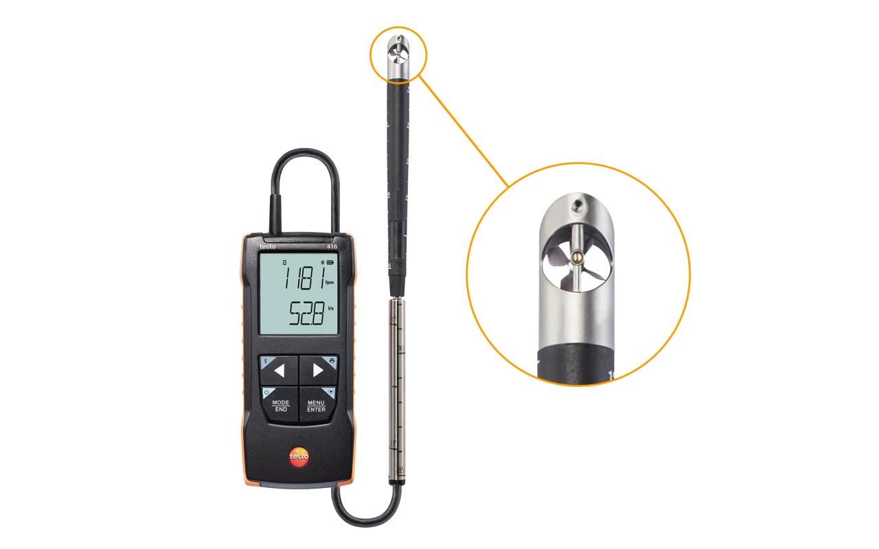 Kompaktowy anemometr Testo 416 z sondą wiatraczkową o średnicy 16 mm to idealne rozwiązanie do prostego, szybkiego i dokładnego pomiaru prędkości przepływu oraz strumienia objętości w kanałach wentylacyjnych.
