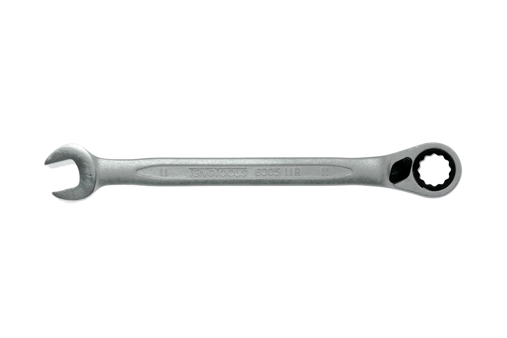 Ze stali chromowo-wanadowej. Klucz na jednym końcu wykonany jako oczkowy wygięty, a na drugim jako oczkowy 12-kątny, zapadkowy. Funkcja zapadkowa z przełączanym kierunkiem pracy prawo-lewo. Główka 12-kątna jest odgięta o 15°. Na obu końcach ten sam rozmiar. Chromowane na mat.N