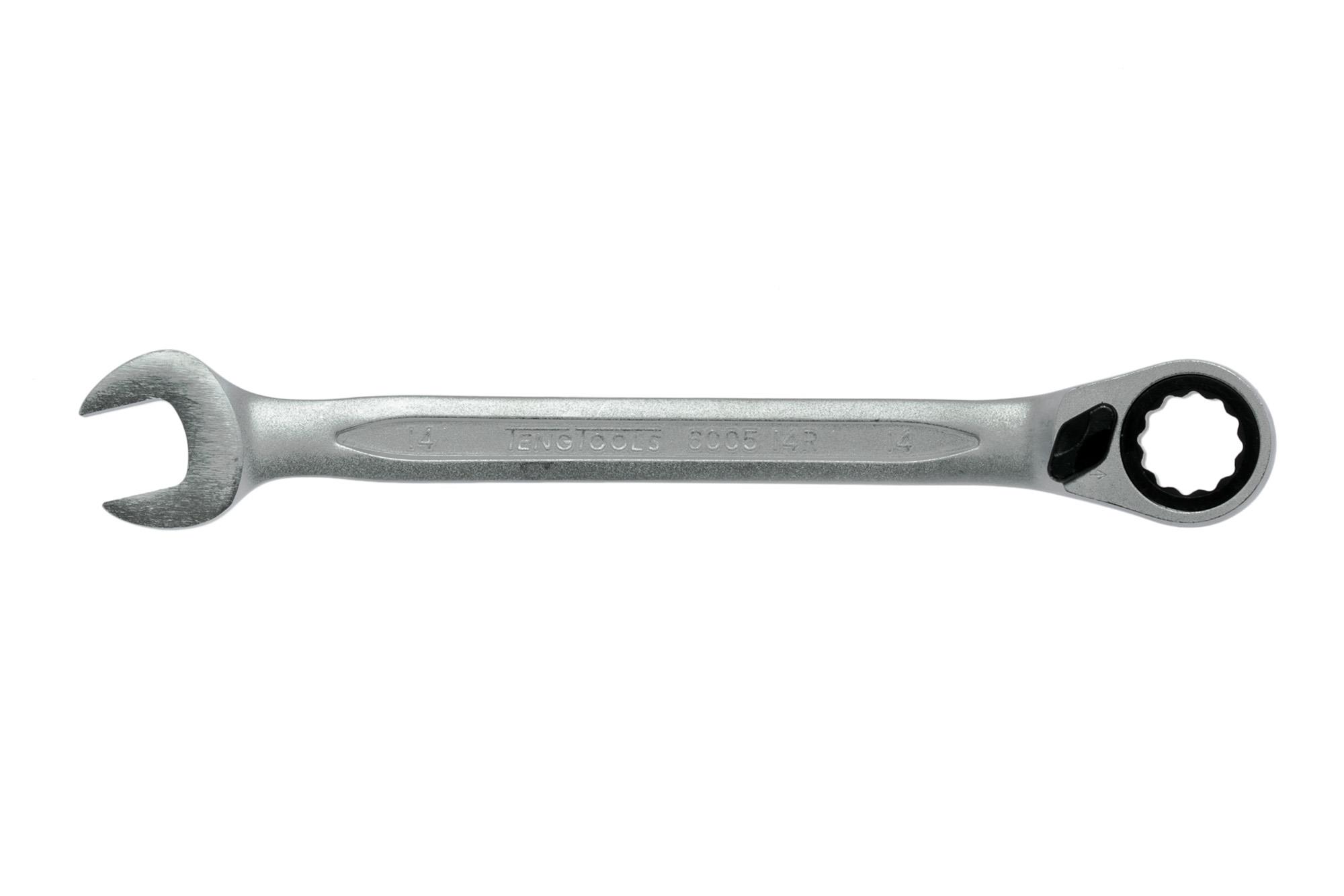 Ze stali chromowo-wanadowej. Klucz na jednym końcu wykonany jako oczkowy wygięty, a na drugim jako oczkowy 12-kątny, zapadkowy. Funkcja zapadkowa z przełączanym kierunkiem pracy prawo-lewo. Główka 12-kątna jest odgięta o 15°. Na obu końcach ten sam rozmiar. Chromowane na mat.N