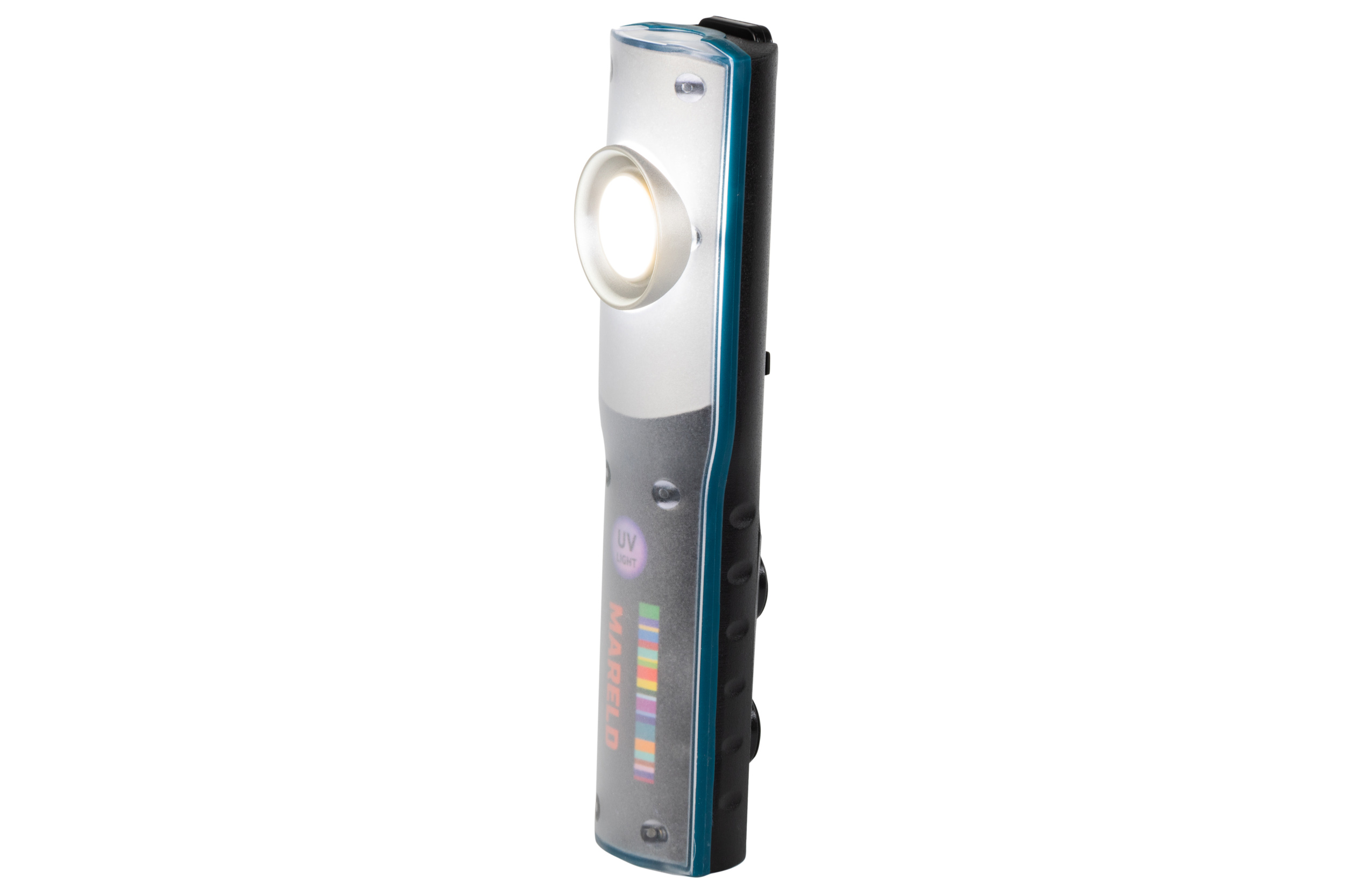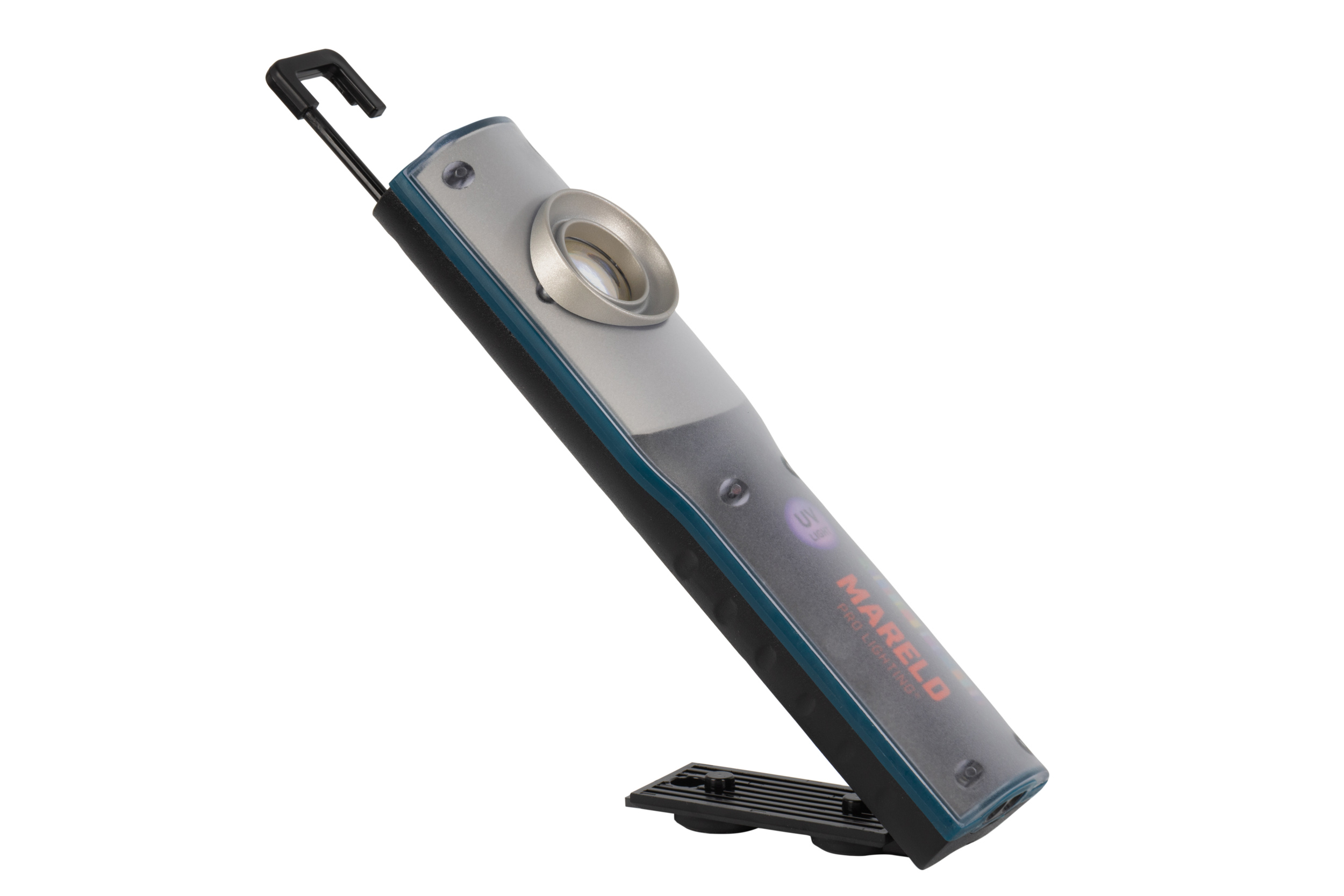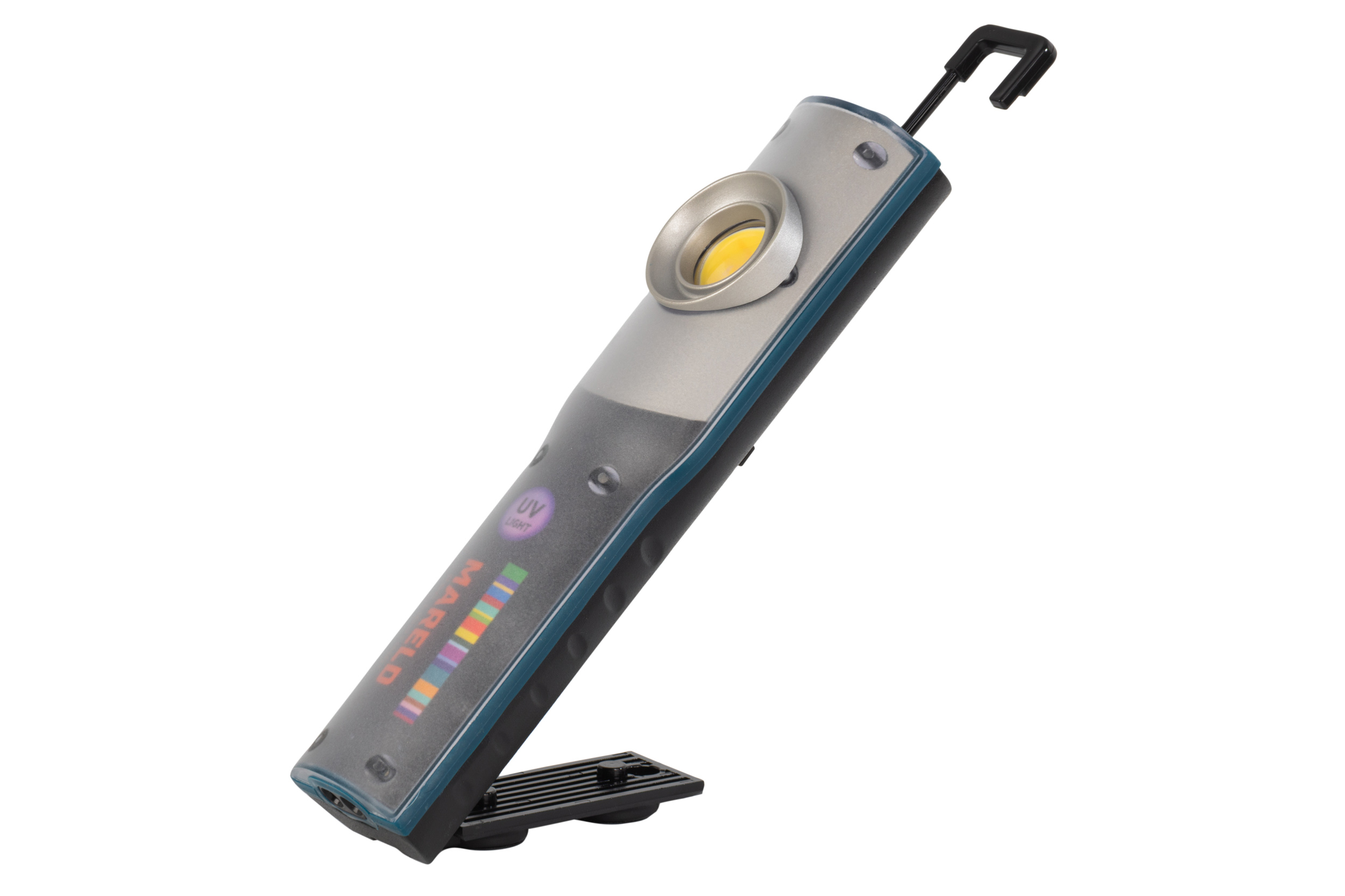 Akumulatorowa lampa ręczna o wysokim współczynniku oddawania barw (RA95), z możliwością regulacji światła zimnego i ciepłego. Lekka, poręczna i wyjątkowo odporna na uderzenia. Magnes i haczyk do zawieszania zapewniają elastyczność użytkowania. Podczas gdy lampa znajduje się w podstawce ładującej i ładuje się, działa funkcja światła awaryjnego, aktywująca się przy zaniku zasilania, która zapewnia siłę światła 100 lm przez ok. 1 godz. Lampa wyposażona jest w źródło światła UV, umieszczone w górnej części lampy. Światło UV pozwala wykrywać pęknięcia, nieszczelności i wycieki w układach chłodzenia lub rurach wodociągowych, a także pleśń w konstrukcjach budowlanych.