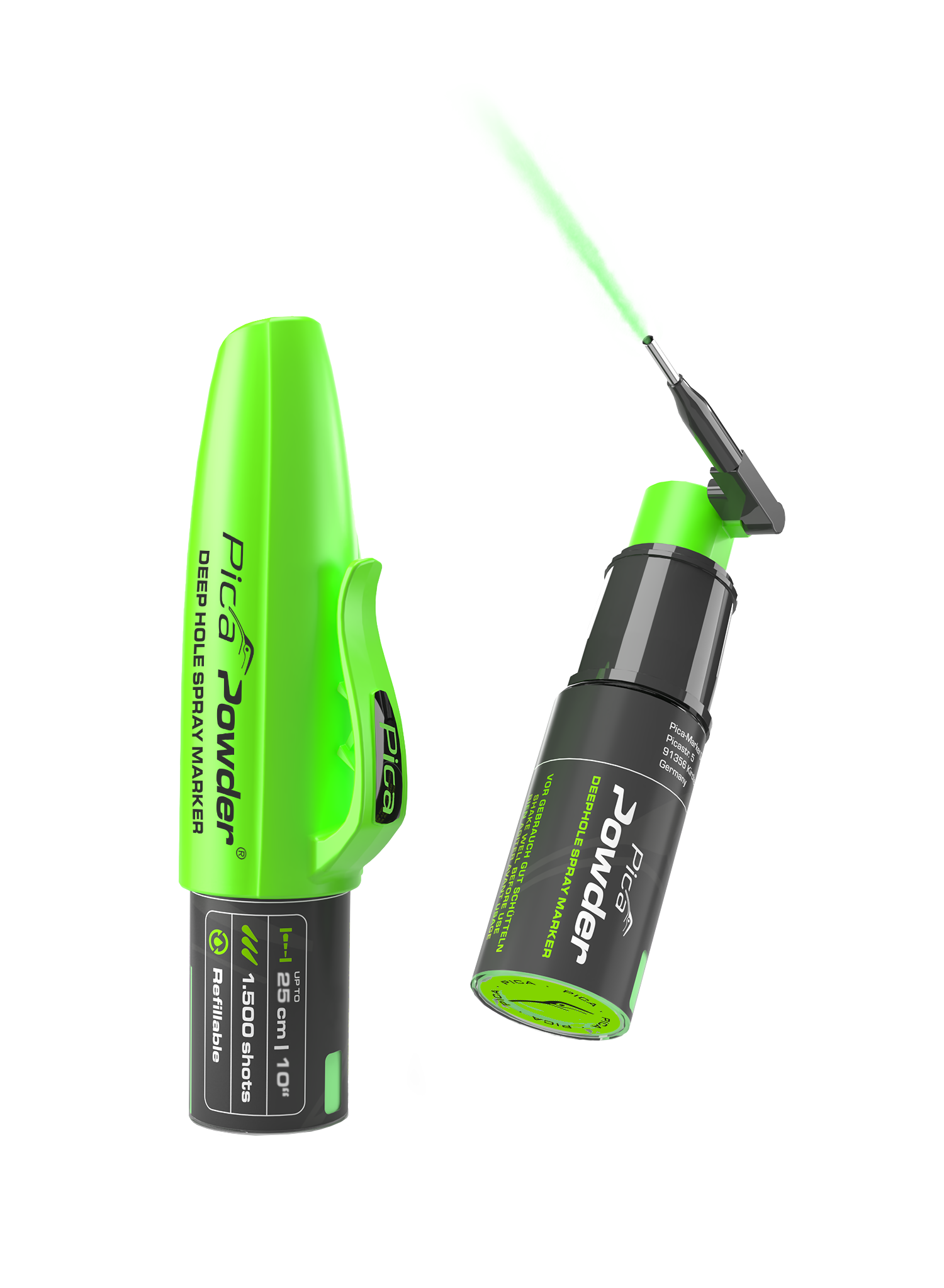 Pica Powder to profesjonalny marker natryskowy do bezdotykowego znakowania otworów o głębokości do 25 cm. Pozostawia trwałe, zielone fluorescencyjne oznaczenia na bazie kredy - idealne dla stolarzy, elektryków, hydraulików i ekip budowlanych.