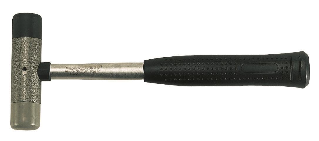 Młotek z jednym obuchem nylonowym, a drugim gumowym. Trzonek z rurki stalowej z gumową, perforowaną rękojeścią.