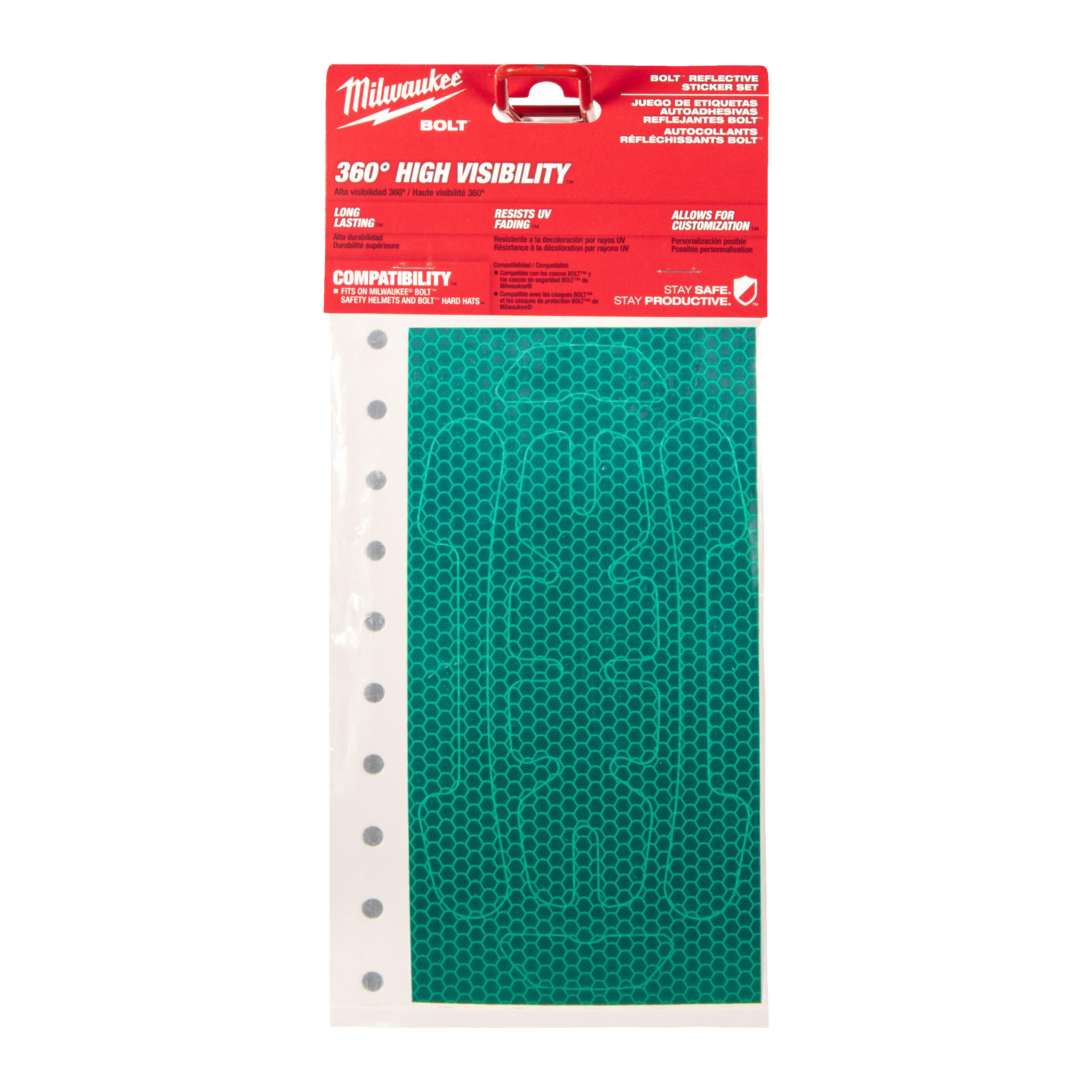 • Zestaw 5 sztuk naklejek odblaskowych zapewnia 360-stopniową widoczność na hełmach ochronnych BOLT™