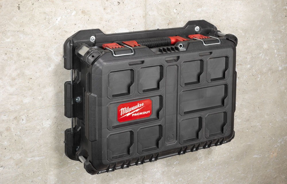 Płyta montażowa PACKOUT™ (nr kat. 4932471638) stanowi solidną bazę umożliwiającą montaż i organizację modułów systemu PACKOUT™ na ścianie, w pojeździe, garażu lub warsztacie.