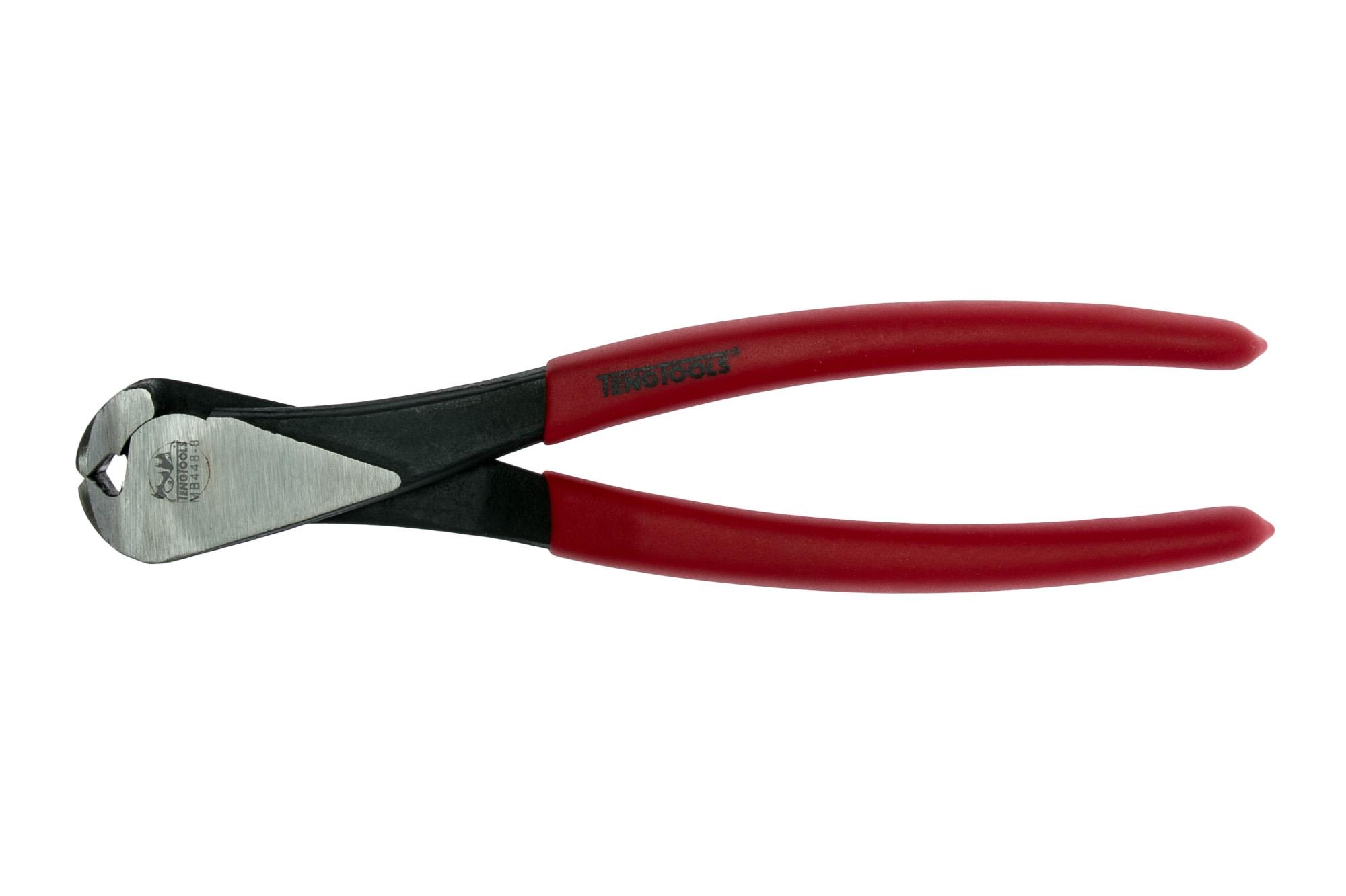 Szczypce tnące czołowe o dużej zdolności cięcia. Ze stali stopowej chromowo-molibdenowej. Polerowane. Z uchwytami pokrytymi plastikiem. DIN 5748.