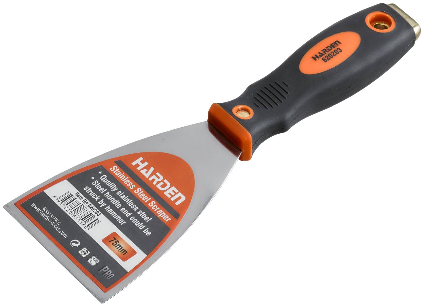 Szpachla stalowa z rękojeścią dwukomponentową z plastyfikowanej gumy, zapewniającą dobry chwyt.