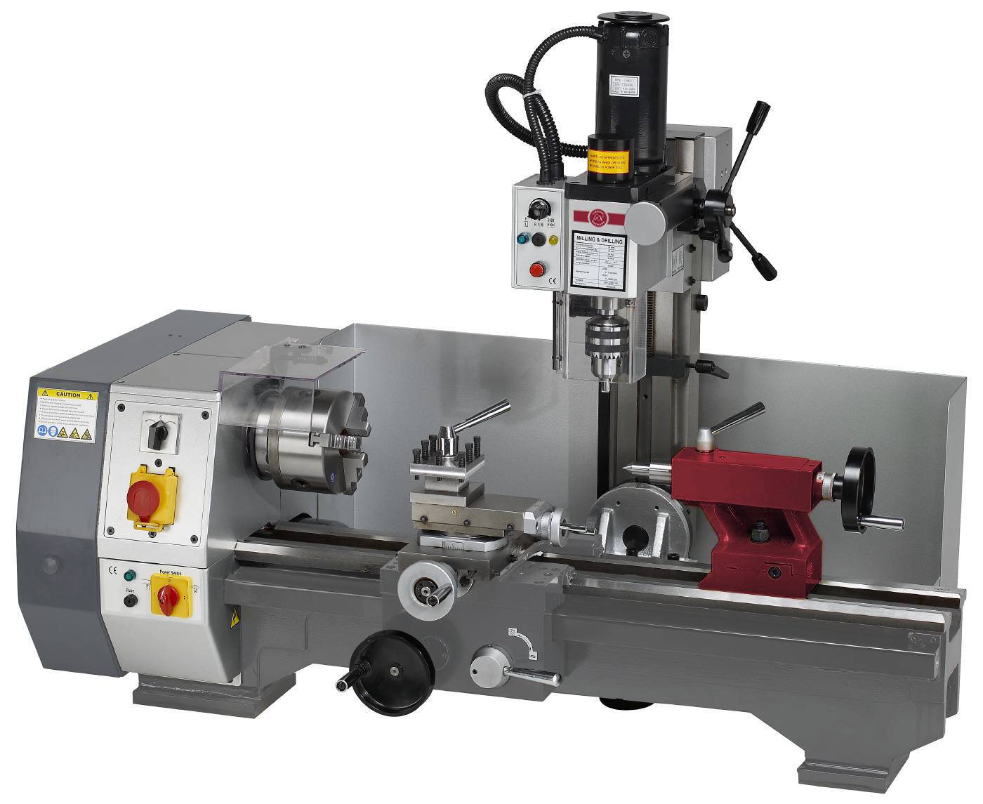 Mocna obrabiarka narzędziowa, nadająca się do modelowni, narzędziowni, warsztatów mechaniki precyzyjnej, szkół, warsztatów samochodowych, a także do majsterkowania i do zakładów serwisowych i naprawczych. Idealna do wytwarzania skomplikowanych, niewielkich elementów do produkcji pojedynczej lub seryjnej. Sztywne łoże pryzmowe, zapewniające precyzyjne prowadzenie suportu i konika. Główne wrzeciono osadzone w mocnych, precyzyjnych łożyskach wałeczkowych. Przeniesienie mocy z silnika do wrzeciona głównego poprzez pasek zębaty. Płynna zmiana prędkości obrotowej w przekładni z paskiem klinowym. Sanki poprzeczne posiadają dwa rowki teowe, służące do mocowania rożnego wyposażenia. Dostarczana w komplecie z silnikiem o jednej prędkości, uchwytem tokarskim ? 125 mm ze szczękami 2x3, sankami narzędziowymi obracanymi z zakresie 360°, kłami stałymi, imakiem szybkiej wymiany do narzędzi 20 mm, przekładnią napędową i osłoną uchwytu tokarskiego.Ponadto maszyna jest wyposażona w głowicę frezową.