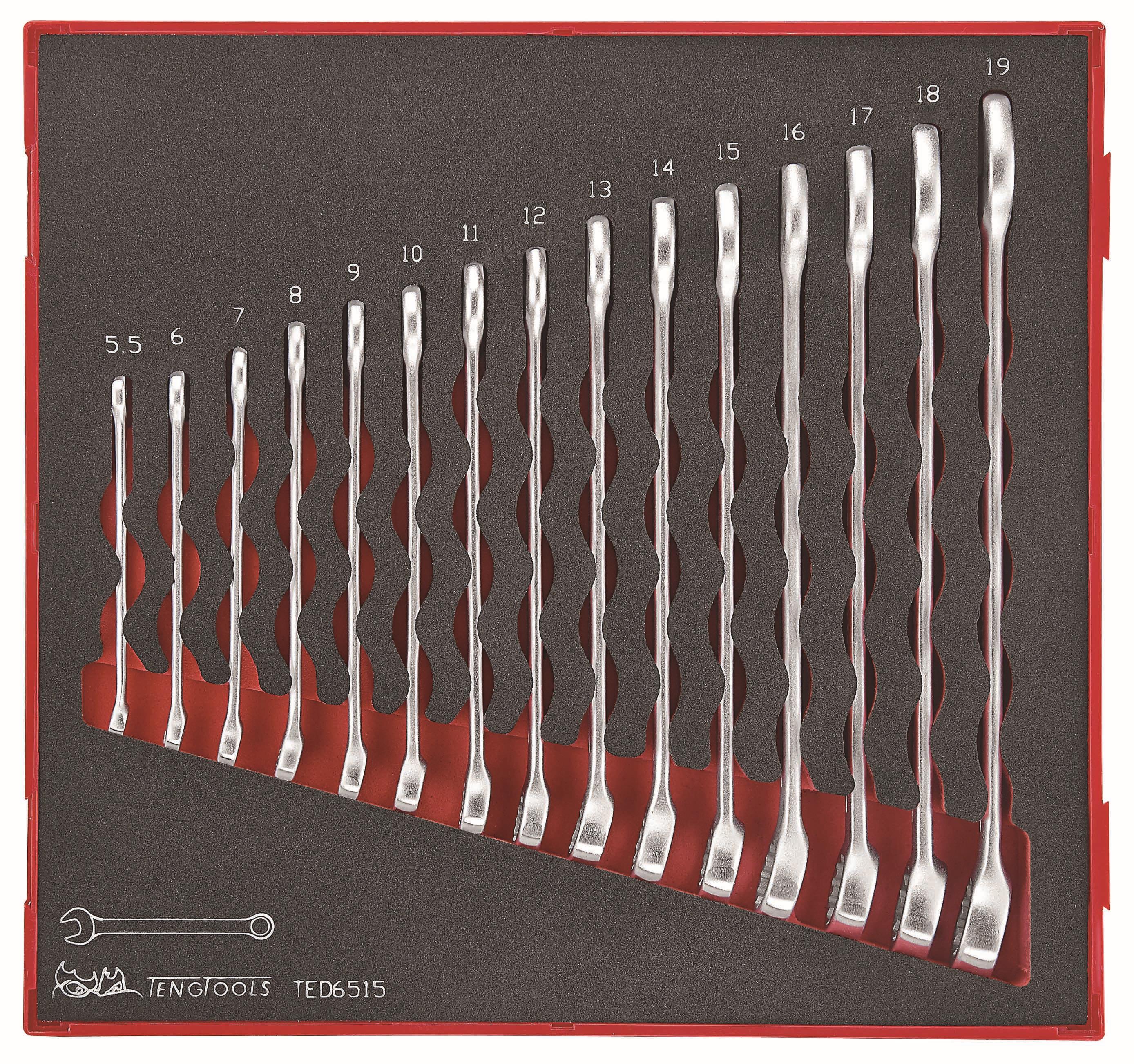 Zestaw 15 kluczy płasko-oczkowych ze stali chromowo-wanadowej. Ten sam rozmiar na obu końcach. Główka pierścieniowa dwunastokątna, odgięta pod kątem 15°. Główki szlifowane. Chromowane. Dostarczany w pojemniku z tworzywa sztucznego z odłączaną pokrywą. Klucze umieszczone są we wkładzie gąbkowym EVA posiadającym trzy warstwy o różnych barwach. Pojemniki pasują do skrzynek i wózków narzędziowych Teng Tools.